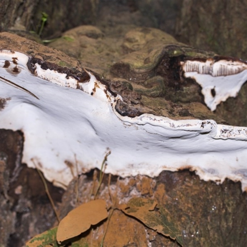 As well as the wholly shelf-like fruitbodies there are those that are flat sheet+shelf. These start as a flat growth on a downward facing surface (e.g. the lower side of a leaning trunk or of a fallen branch lying on the ground). After a while the upper edge of this sheet-like growth turns out from the wood to form a horizontal shelf. Technically such a composite growth form is described as effused-reflexed (effused: the sheet-like bit; reflexed: the shelf). In some species the shelf constitutes a significant proportion of the fruitbody and such species are included here.