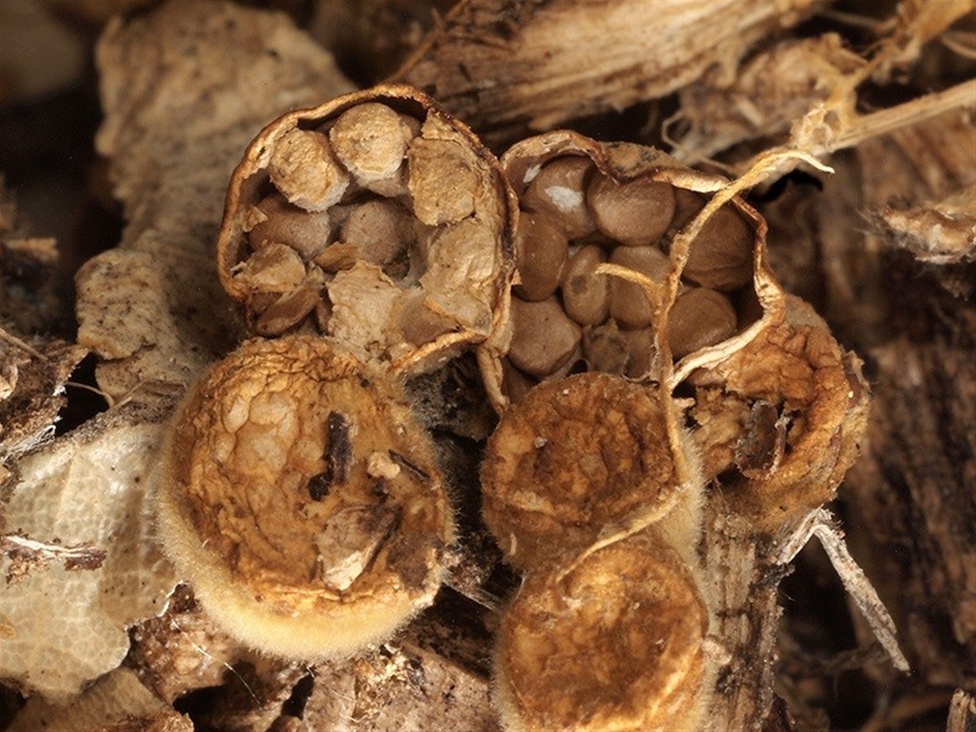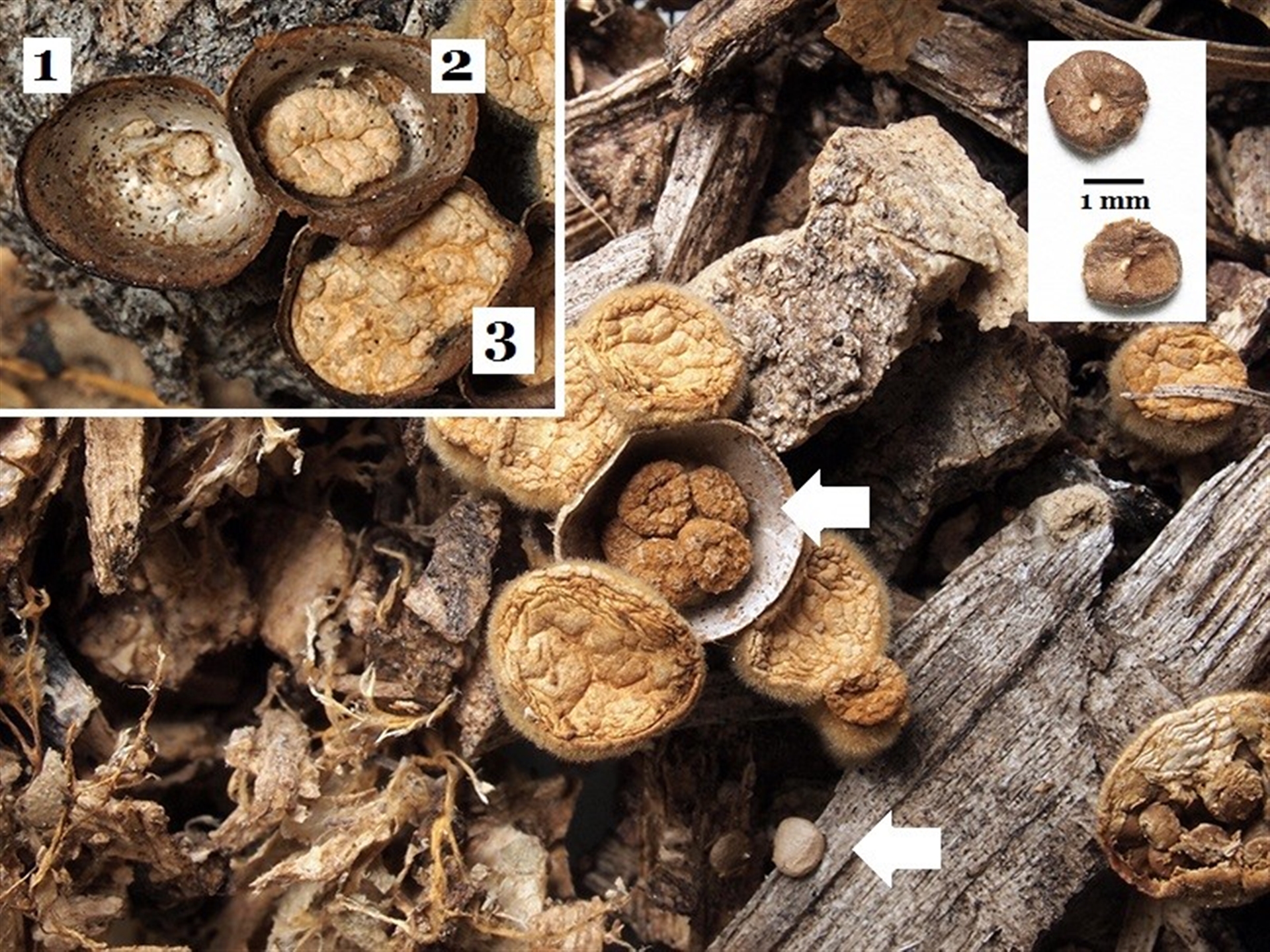 Heino1 NatureMapr Canberra & Southern Tablelands Cup with one or more 'eggs' inside [birds nest fungi and cannonball fungus] Disk-like to cup-like Fungi Crucibulum laeve