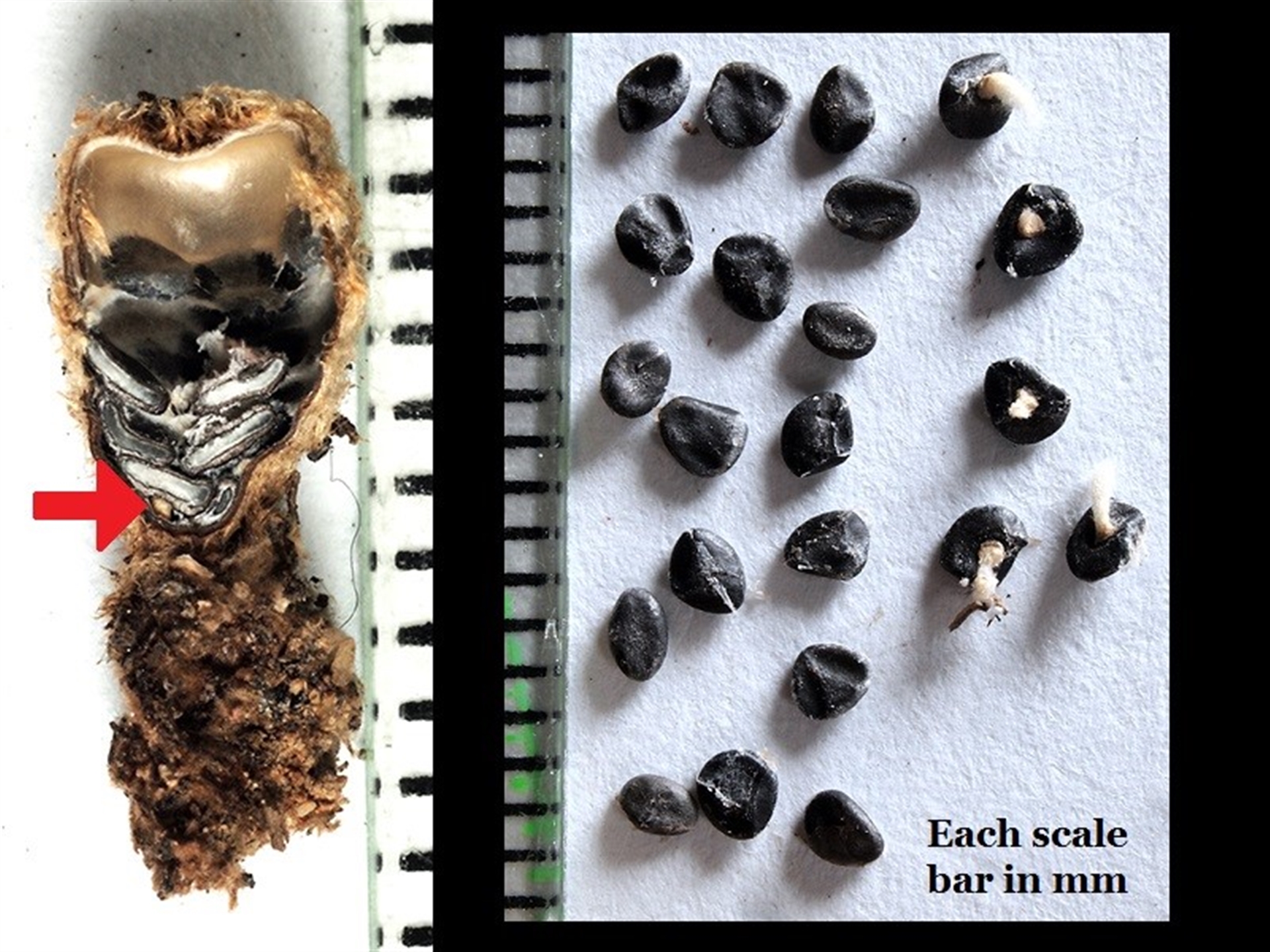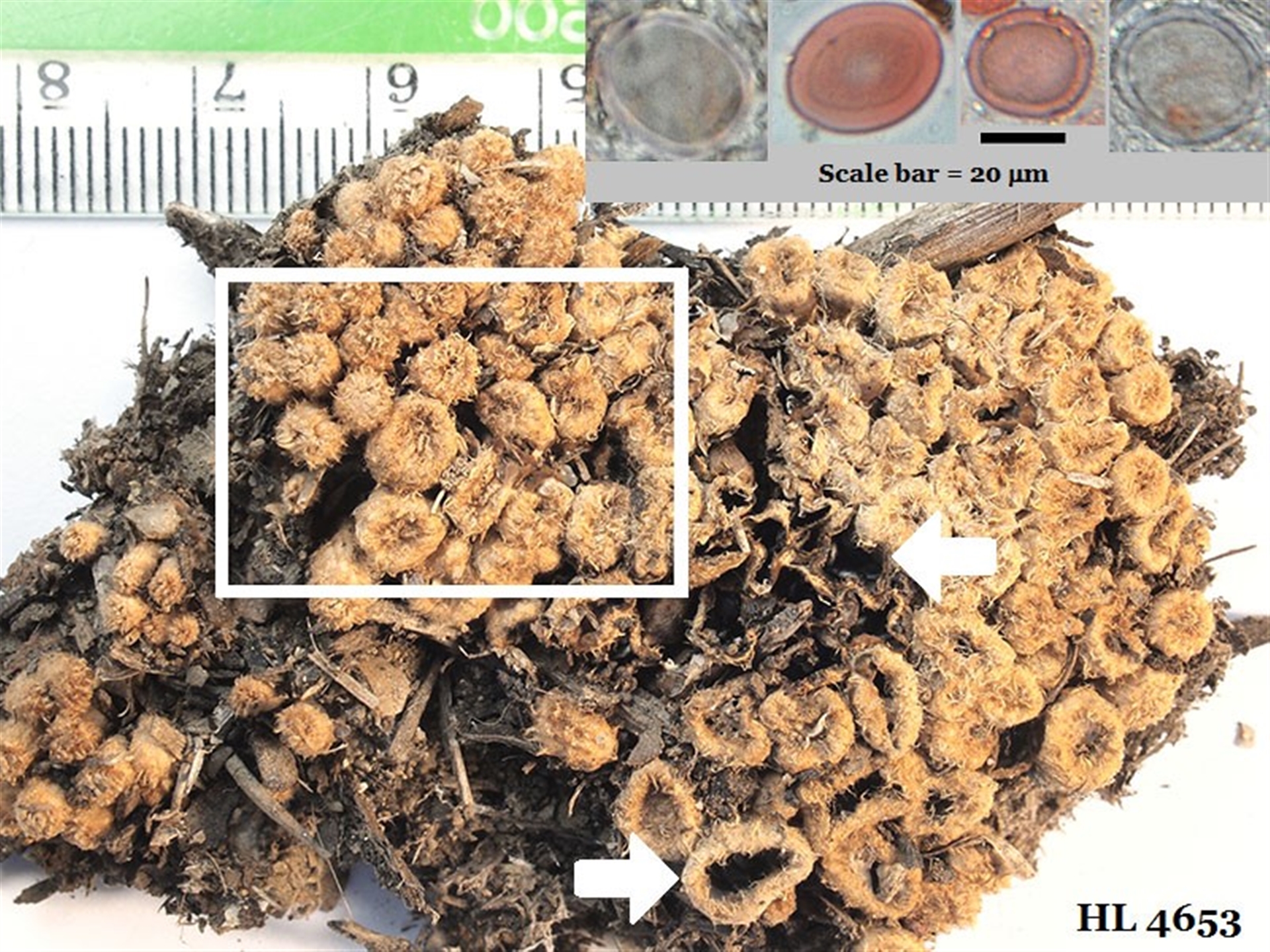 These photos show various fruit bodies in one herbarium collection. The specimens were dried after collection. However, the fruit bodies have a low water content and so look much like this out in the wild (particularly in dry conditions). Photo 1 shows fruit bodies with the epiphragms still intact. The white rectangle in Photo 2 marks what you saw in Photo 1. The white arrows point to two fruit bodies in which the epiphragms have broken and so left the mouths of the fruit bodies open. At the upper right are four spores (naturally colourless but two I have stained red). On the left in Photo 3 you see one fruit body cut in half (with a large lump of substrate still attached at the bottom). In the peridiole-free upper area you can see the smoothness of the fruit body’s inner wall. The arrow points to the connection between one peridiole and the inner wall. On the right I show all the peridioles that were in one fruit body. The rightmost five have white funiculi. All the other peridioles lack funiculi and were I to turn them over you’d again see smooth, black surfaces. For a markedly different example see