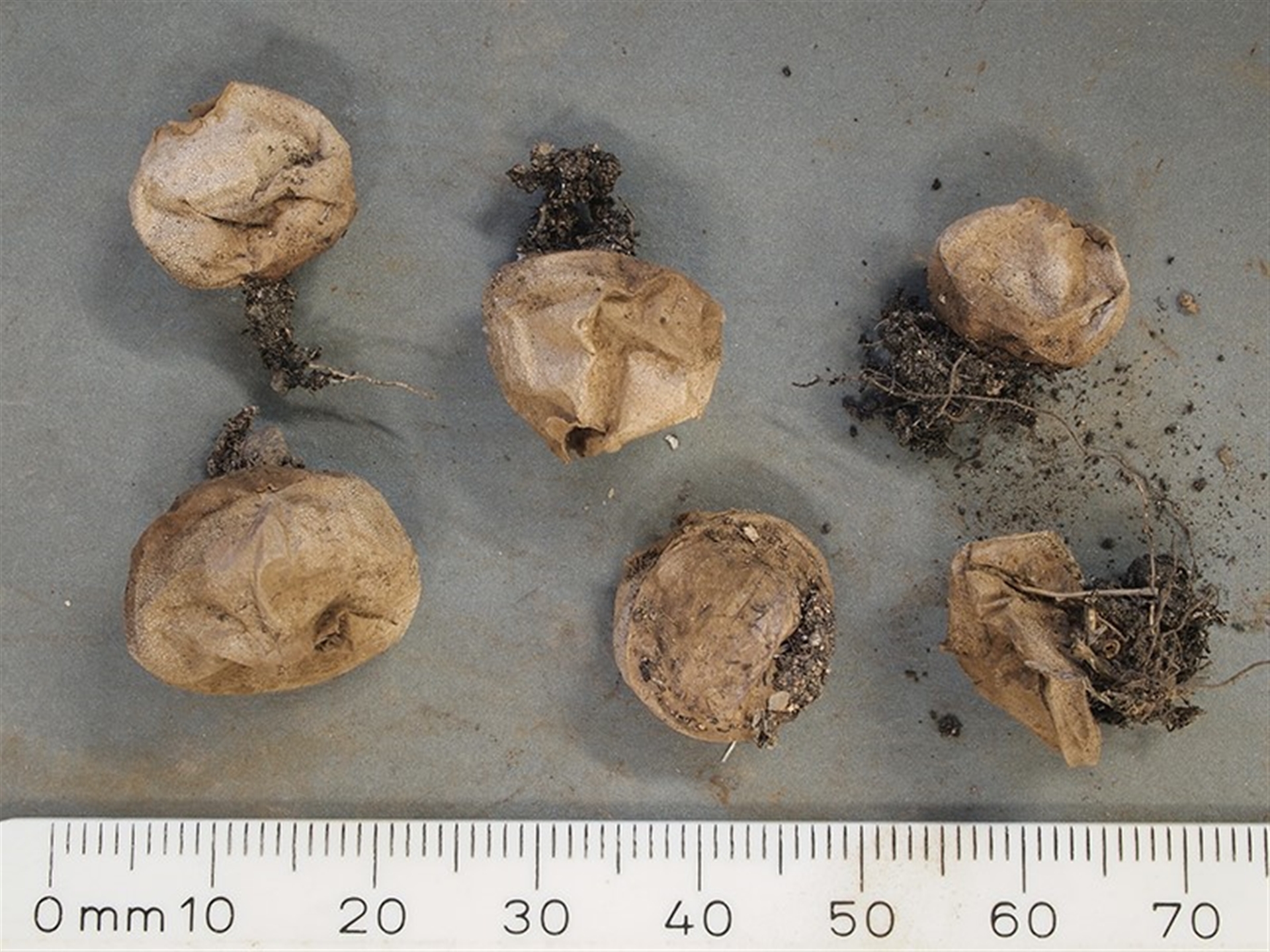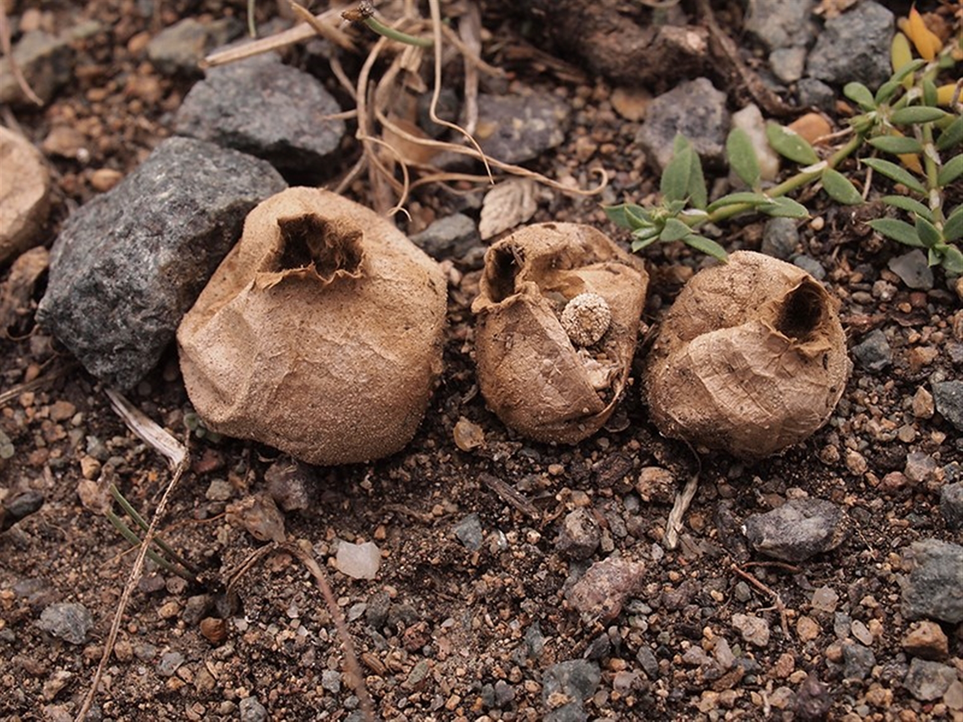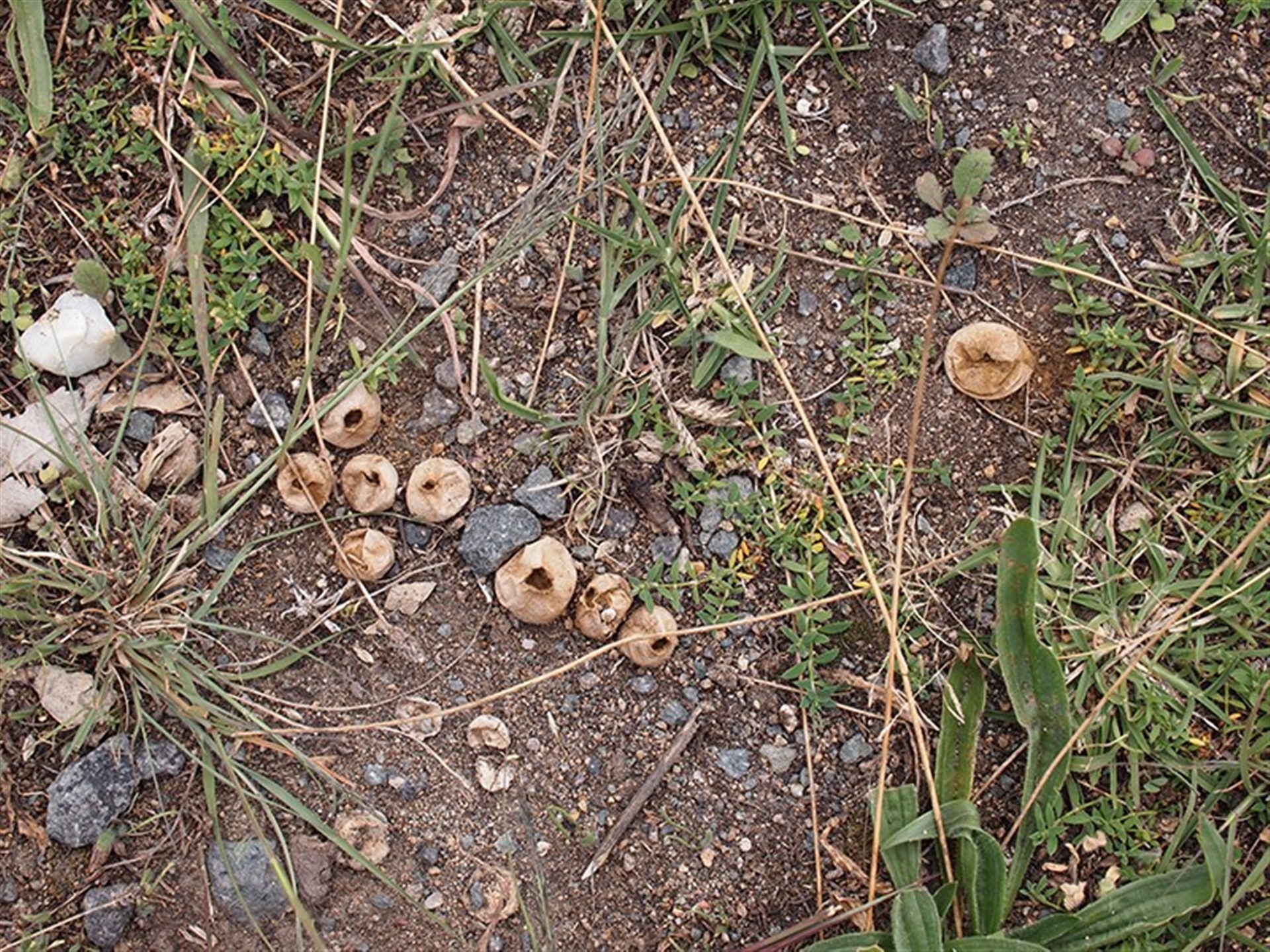 This is an example of a Bovista with a well-developed, cord-like anchoring strand. You see that well in the fruit body at the upper left of Photo 3. Soil adheres to the hyphae that make up that cable-like strand and all fruit bodies were still quite firmly attached to the ground. An attempt at an ID to species left me unsatisfied, so for now it’ll have to stay just as genus.
