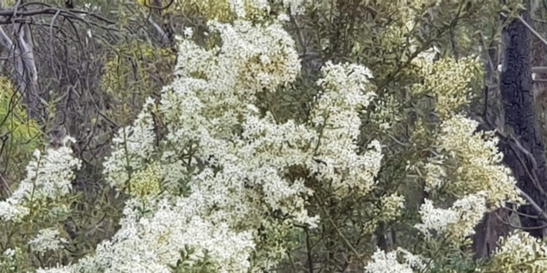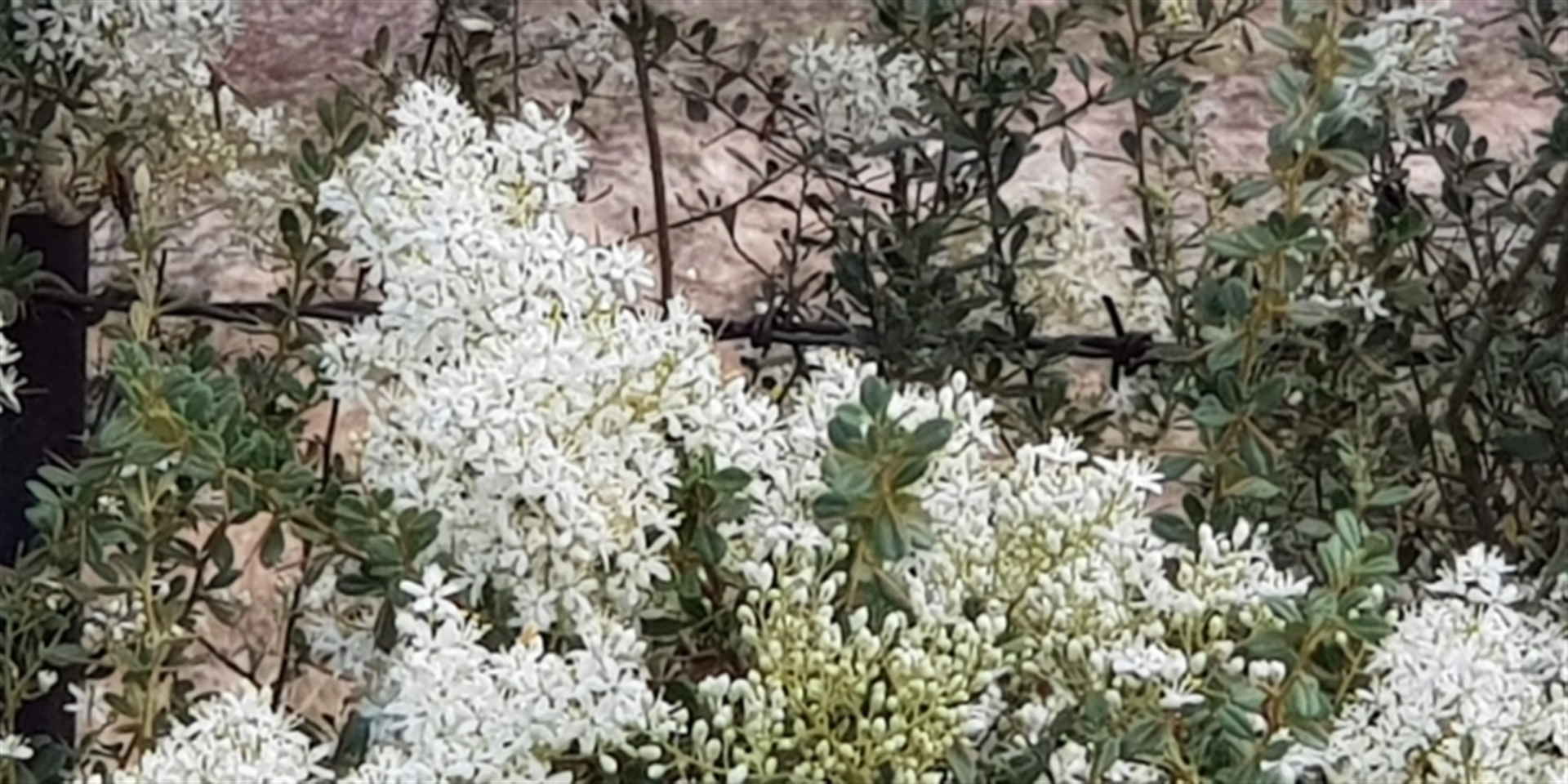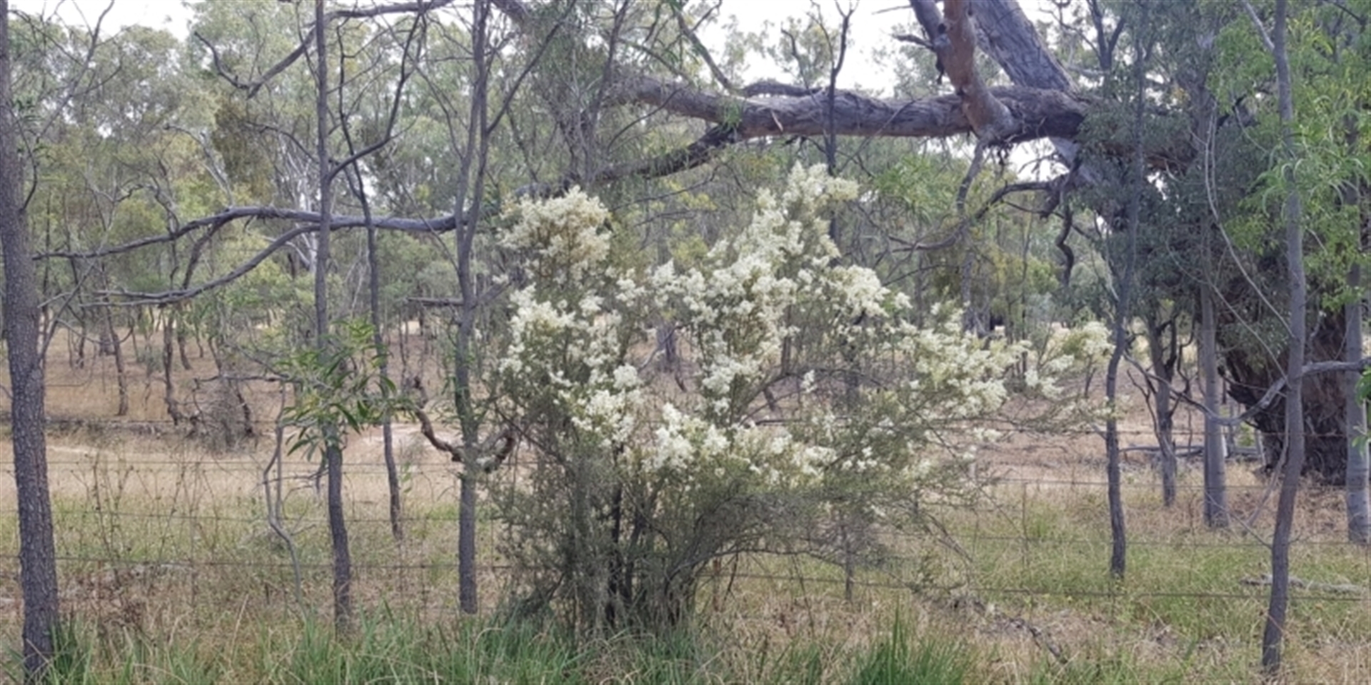 Bursaria shrubs in full bloom, alongside fenceline of Horse trail. A number of these shrubs all flowering +/- Synchronously, spread over an area of several hundred sq. metres. Mature plants, no evidence of seedlings, probably due to herbivore grazing pressure. Overhead broken canopy of Gum trees. A lot of Herbaceous weeds present below and between Bursaria plants. Important Habitat shrub for Small Bird Nesting sites (protective thorns).