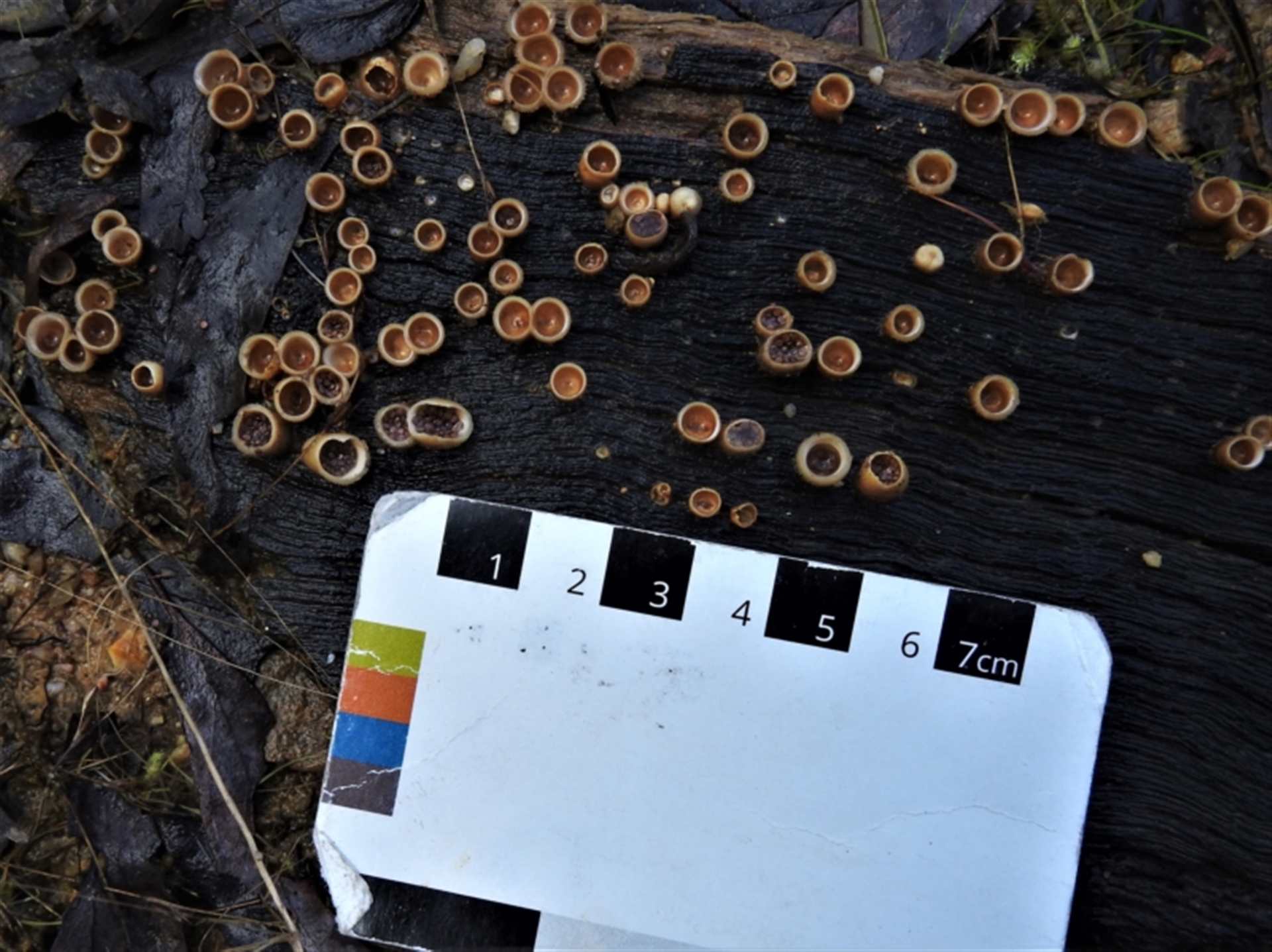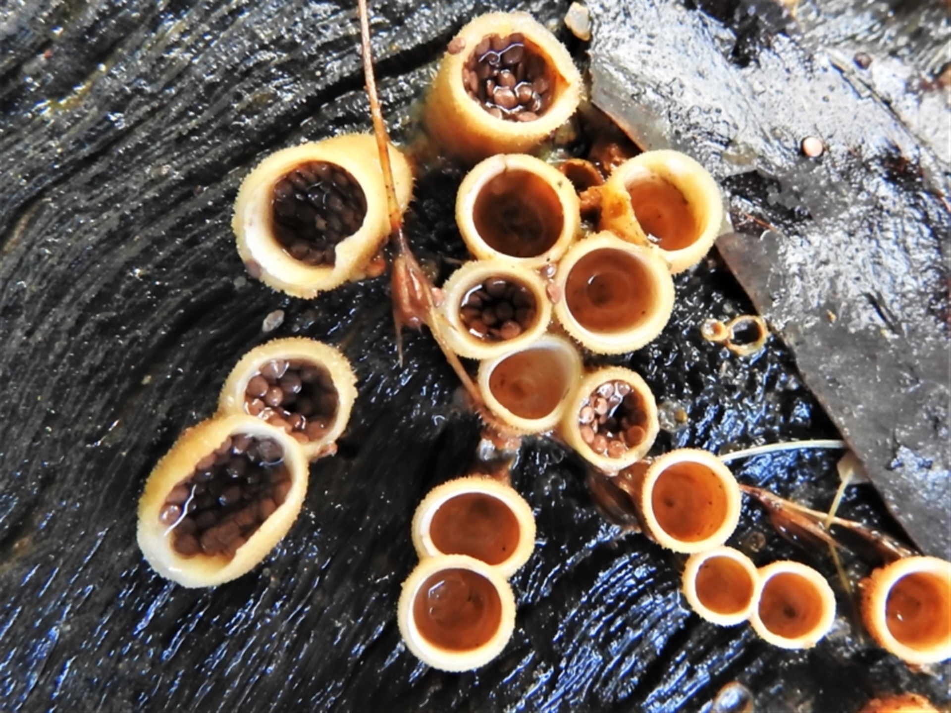 Fungi Cup with one or more 'eggs' inside [birds nest fungi and cannonball fungus] Disk-like to cup-like JohnBundock Canberra & Southern Tablelands NatureMapr Nidula niveotomentosa
