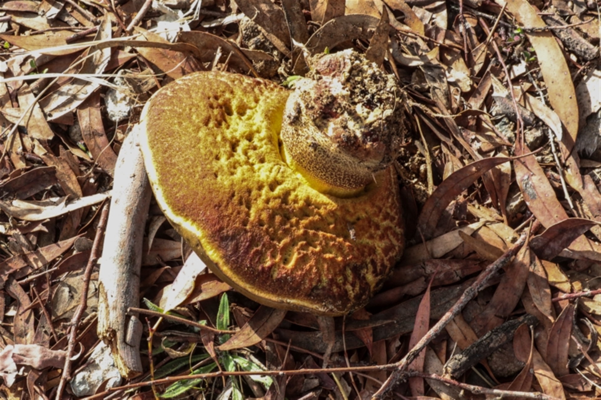 AlisonMilton Canberra & Southern Tablelands NatureMapr Boletes - Fleshy texture, stems central (more-or-less) Caps on stems; pores below caps [boletes & stemmed polypores] Fungi Bolete sp.