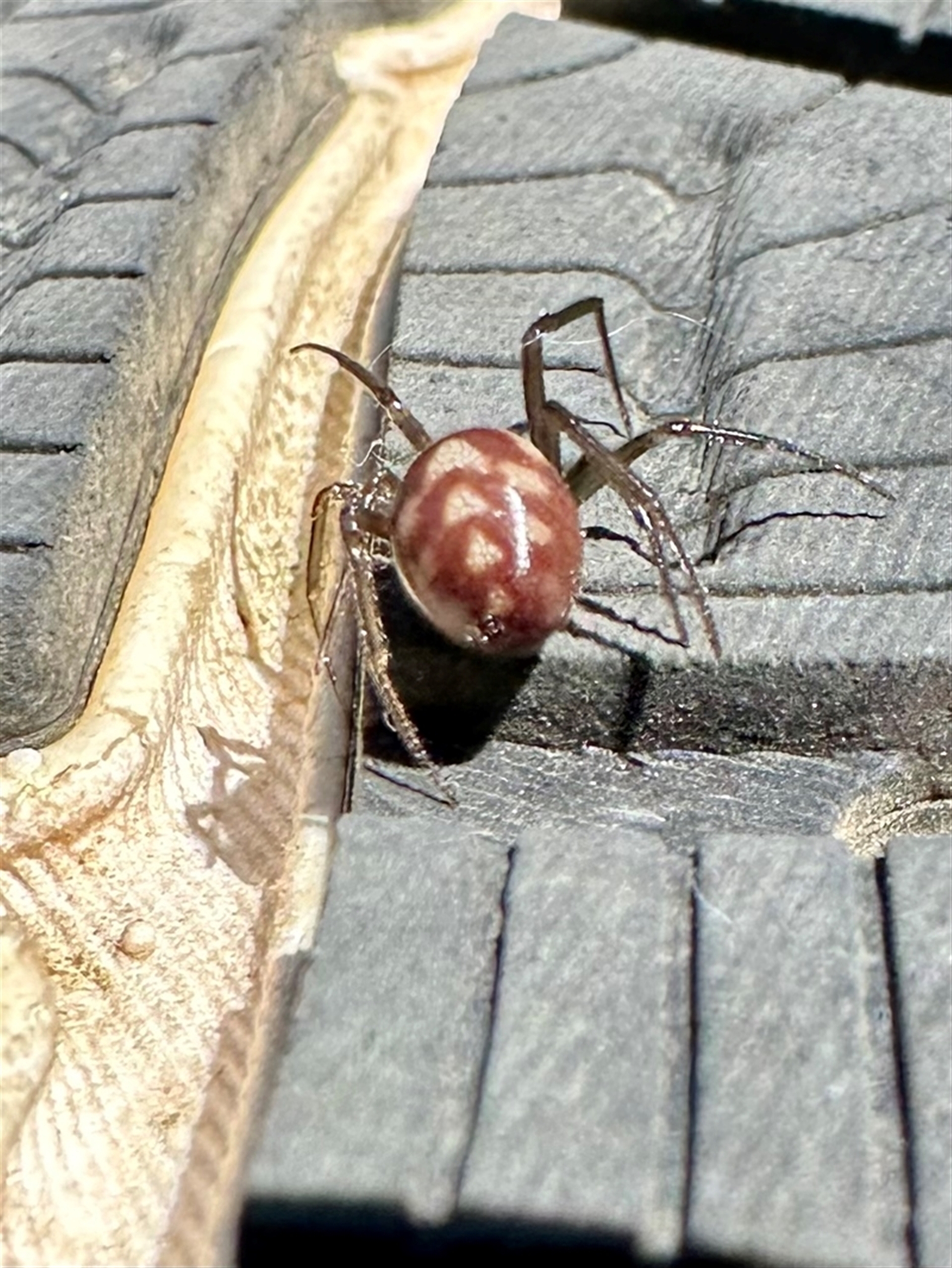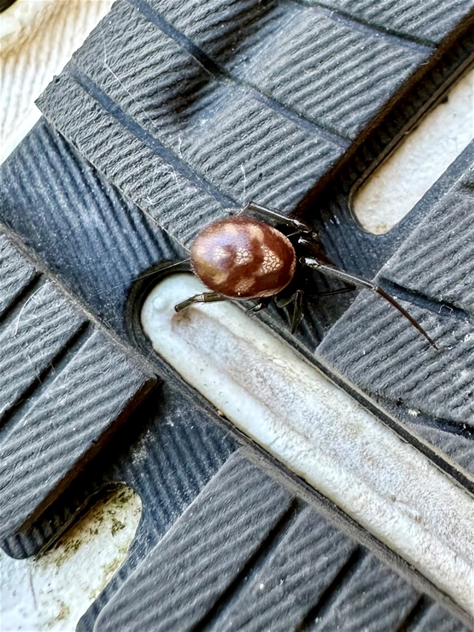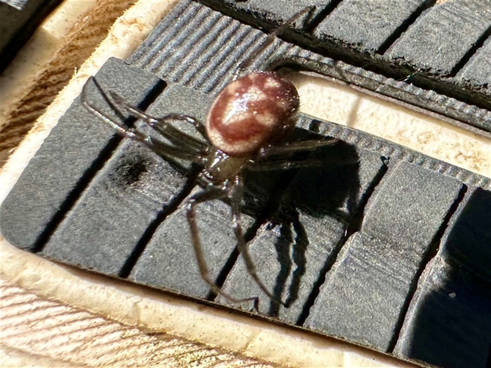 Small brown spider with white dots on abdomen- glossy body. Found inside house on shoe.