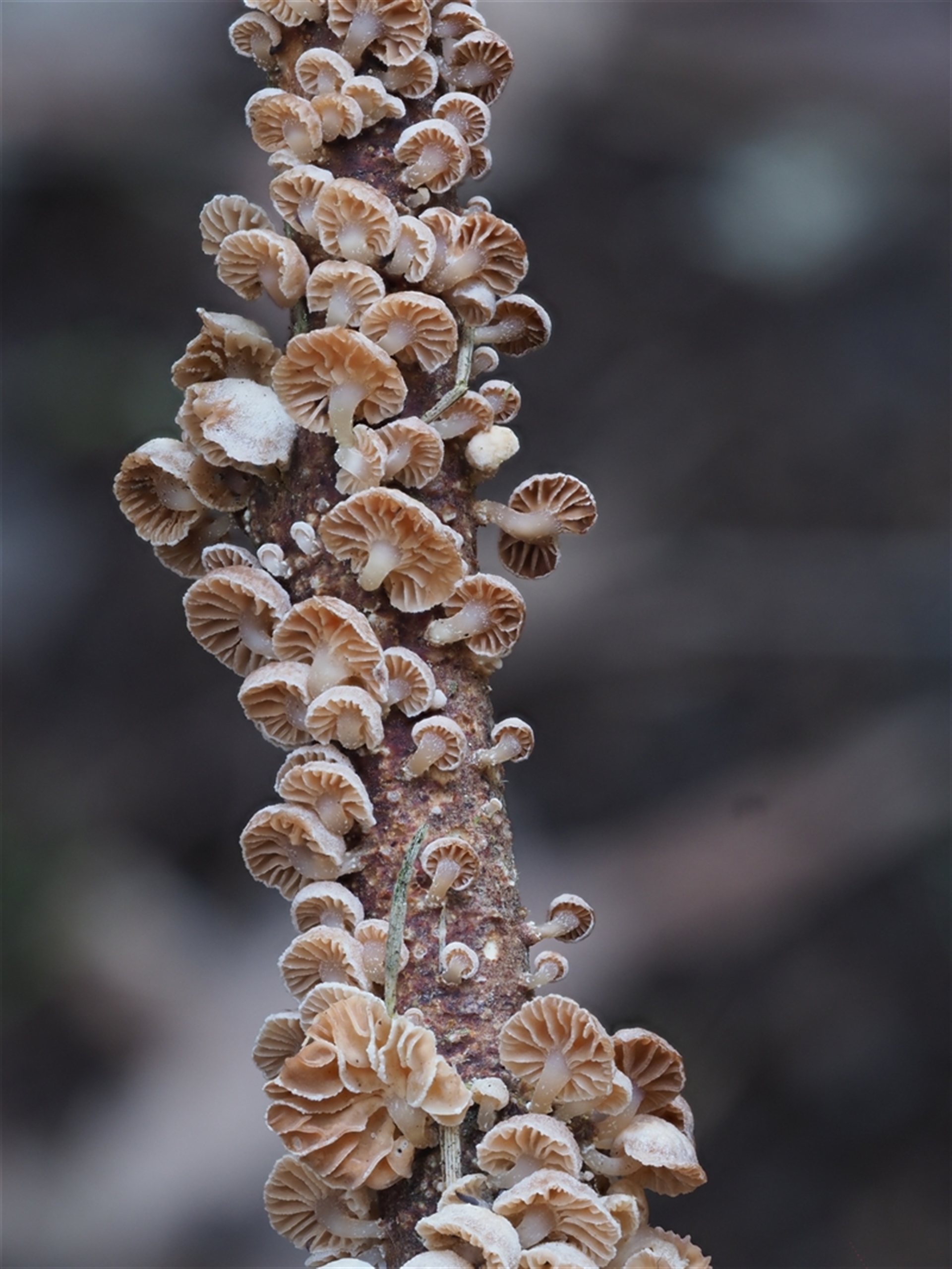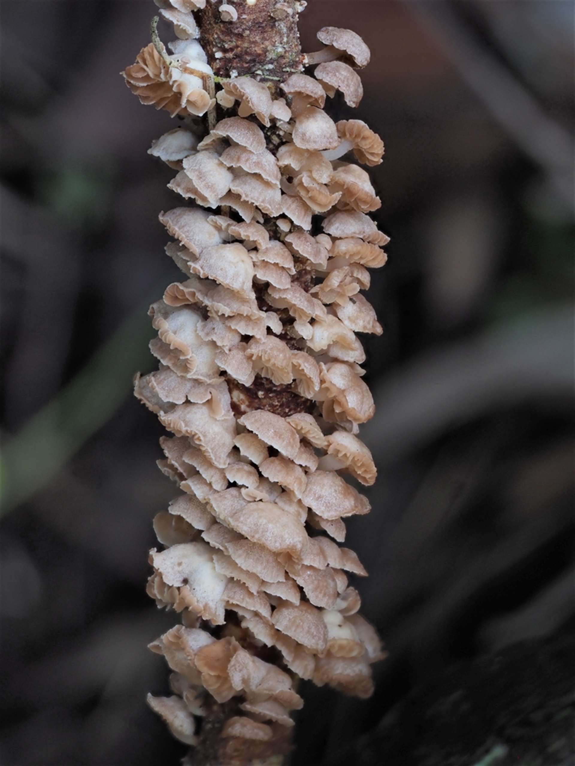 Count of many densely packed caps growing over several decaying branchlets